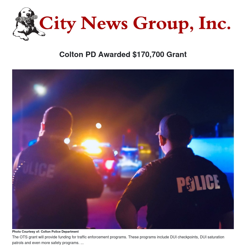 The Colton Police Department has been awarded a $170,700 grant from Office of Traffic Safety (OTS) for the fiscal year 2020-21.