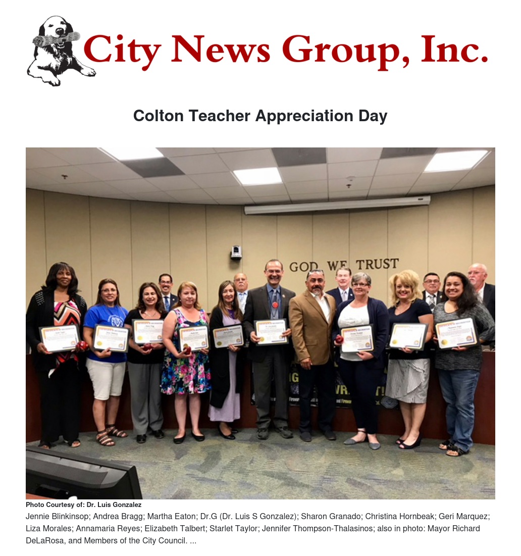 The names of the Colton City Teachers who were in attendance (photo) at the May 15 Council meeting are: Jennie Blinkinsop; Andrea Bragg; Martha Eaton; Dr.G (Dr. Luis S Gonzalez); Sharon Granado; Christina Hornbeak; Geri Marquez; Liza Morales; Annamaria Reyes; Elizabeth Talbert; Starlet Taylor; Jennifer Thompson-Thalasinos; also in photo: Mayor Richard DeLaRosa, and Members of the City Council.
