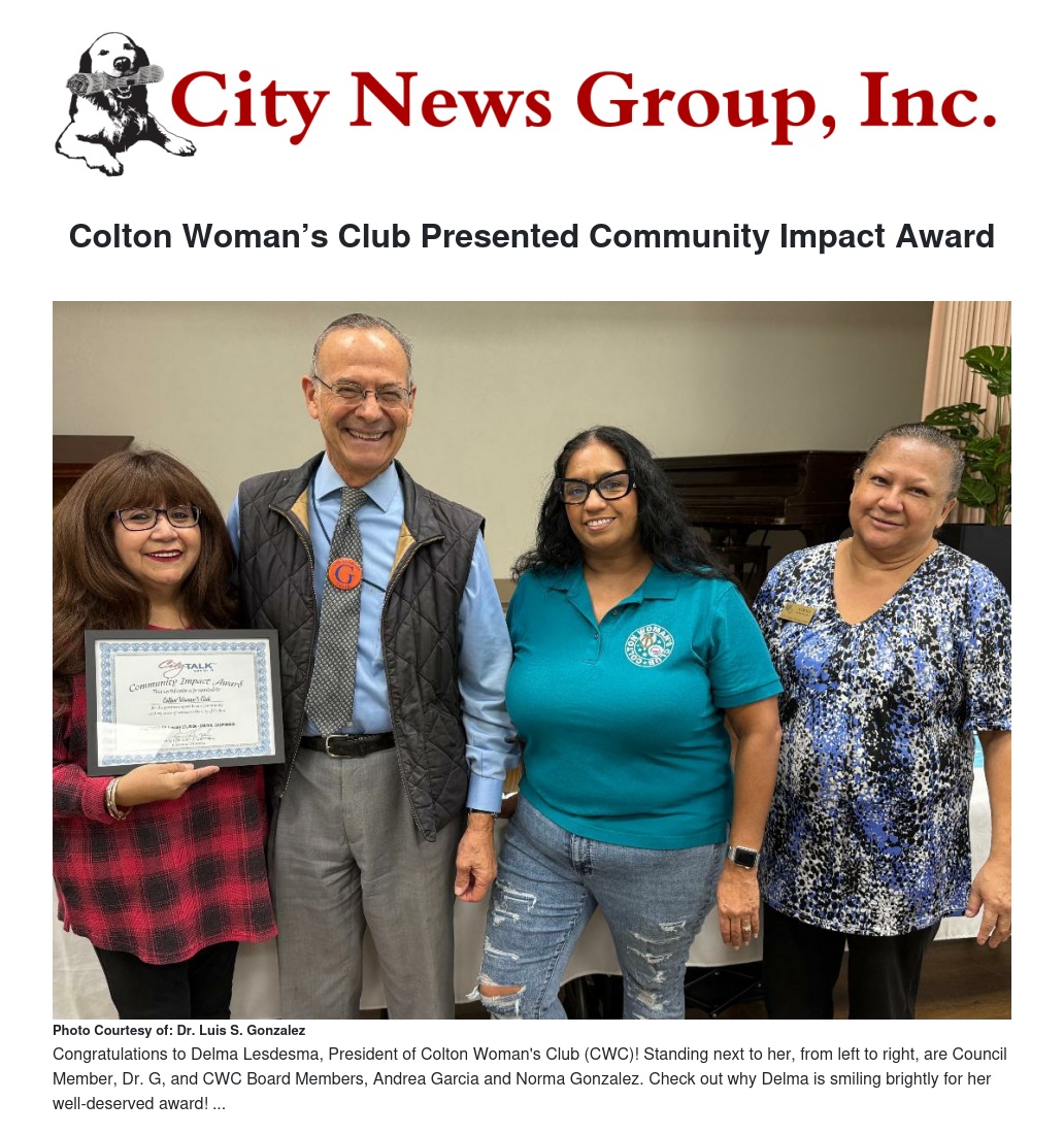 The CITY TALK “Community Impact Award” was established in 2019 to recognize the great efforts that groups and individuals make “behind the scenes” to make our community, the City of Colton, a better place. The Colton Woman’s Club is an excellent choice for this recognition, and truly represents the very best, in terms of recognizing positive contributions to the community of Colton, which is the purpose of this award. Congratulations to President Delma Lesdesma, the Board, and all the members of the Colton Woman’s Club for their dedication, hard work, and contributions.