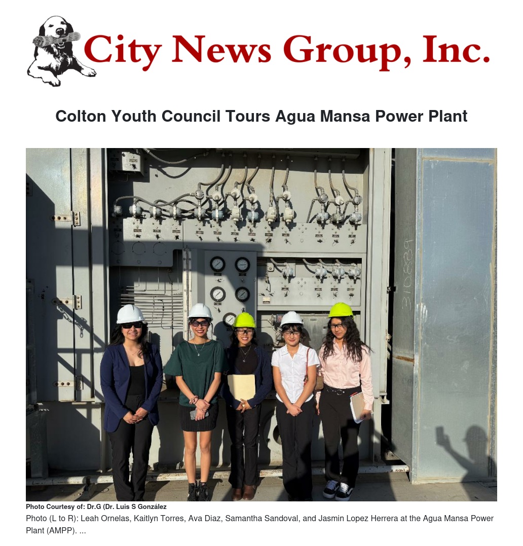 Last week was the February meeting of the City of Colton Youth Council. Starting in August each year, the Youth Council meets monthly throughout the school year to learn about leadership, the history of Colton and the basic operations of our city. The focus last week was on the Colton Electric Department, which was highlighted by a presentation given by Electric Utility Director, Charles Berry. Included in this session were handouts, a video, and a tour of the monumental Agua Mansa Power Plant.