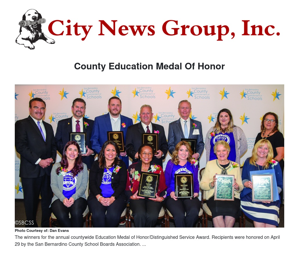 Each year, the San Bernardino County Superintendent of Schools, along with the San Bernardino County School Boards Association and County Communicators Network, recognizes individuals and groups who give outstanding service and support to public education with the countywide Education Medal of Honor.