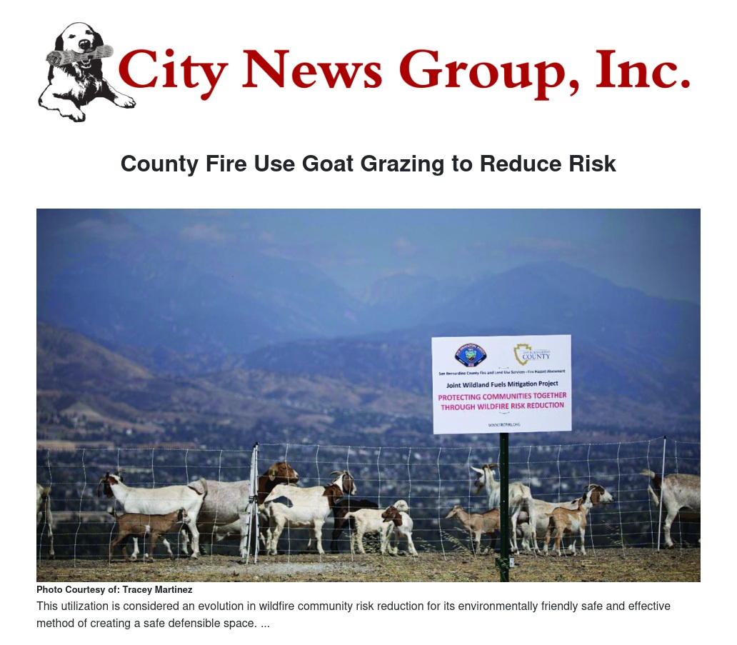 On June 30, the San Bernardino County Fire Protection District (SBCoFD) announced an evolution in wildfire community risk reduction. SBCoFD and San Bernardino County Land Use Services (SBCoLUS) will use goats to clear dry, grassy fuels that increase the threat of wildfire for hundreds of residents in the Little Mountain neighborhood of San Bernardino. This unique community risk reduction project is an environmentally friendly, safe and effective method of creating defensible space.