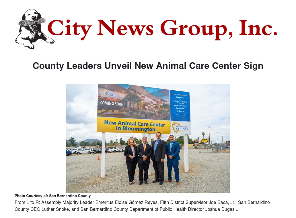 San Bernardino County leaders on Wednesday unveiled a "coming soon" sign for a new state-of-the-art Animal Care Center in Bloomington.