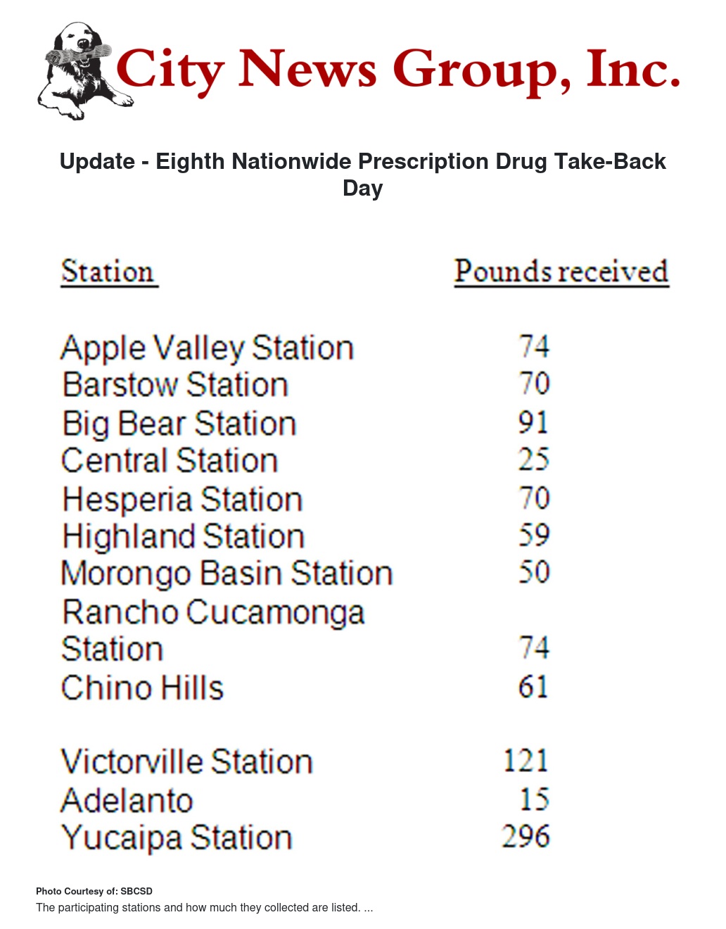 Over one thousand pounds of unused, unwanted prescription drugs were turned in to twelve San Bernardino County Sheriff’s Department locations that participated in the Eighth Nationwide Prescription Drug Take Back Day that was held on Saturday, April 26. 2014.