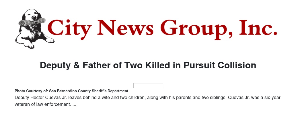 Tragically, during the pursuit, a collision occurred that resulted in fatal injuries to the deputy involved. The deputy was 36 year old Deputy Hector Cuevas Jr.