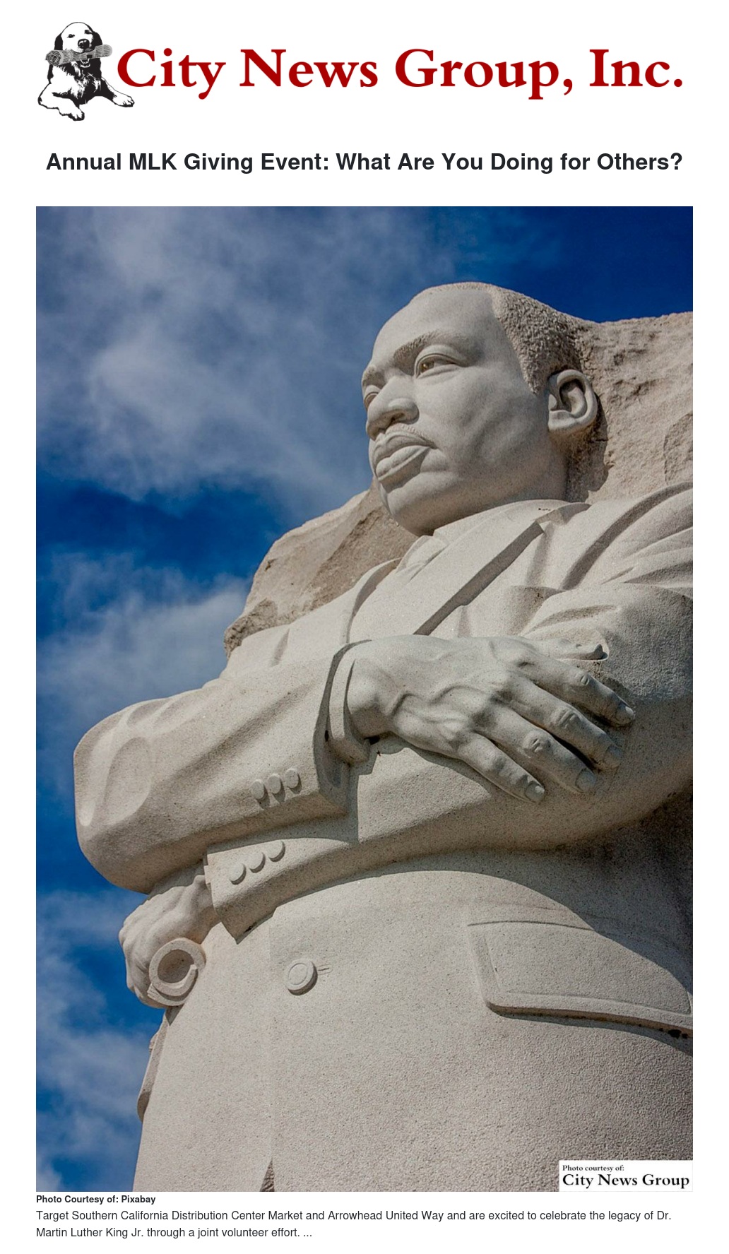 Target Southern California Distribution Center Market and Arrowhead United Way and are excited to celebrate the legacy of Dr. Martin Luther King Jr. through a joint volunteer effort. Target Corporation has a strong culture of giving and has given back 5% of its profits to the community since its inception over 50 years ago. On the day of the event there will be over 50 Target employees at Morgan Elementary to lend a hand and to honor Dr. King by ‘doing for others.’