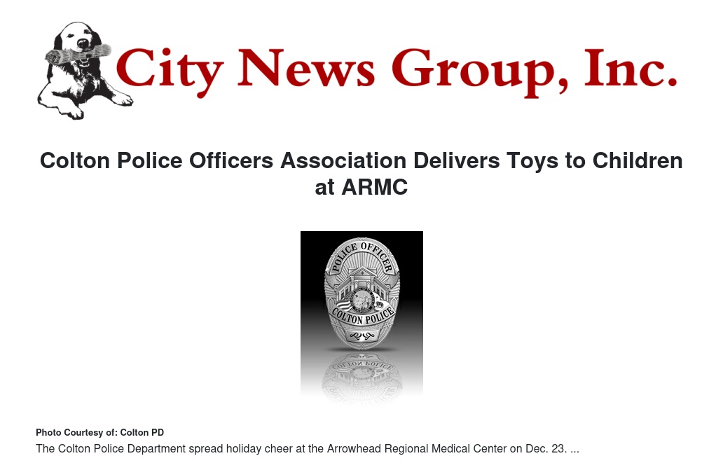 On Dec. 23, prior to the Christmas holiday, members from the Colton Police Officers' Association arrived at Arrowhead Regional Medical Center (ARMC), to deliver toys, candy and Christmas cheer to kids and families spending the holidays in the hospital.