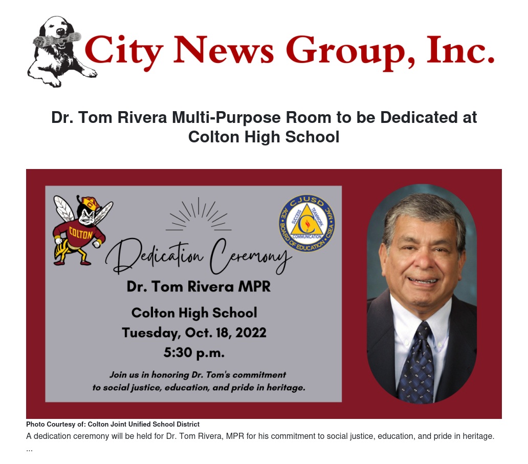 The Colton Joint Unified School district will celebrate a special event on Oct. 18 dedicating Colton High School’s new Multi-Purpose Room to Dr. Tom Rivera, a tireless advocate who was ever faithful to the youth and community of the Colton Joint Unified School District and the Inland Empire.
