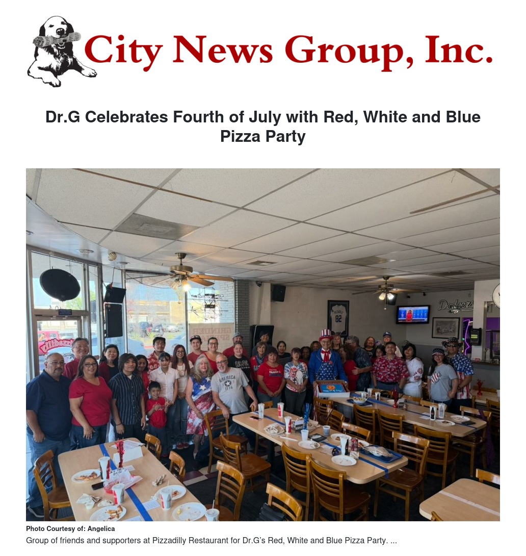 Shirwin and Denise, the owners of Pizzadilly Restaurant, were great hosts for the event, and had everything ready at 6:05pm to allow time for DrG’s prayer, the Pledge of Allegiance and the patriotic trumpet song. “This event was great for the people to relax and celebrate,” smiled Tish Baden, who is a good friend and Dr.G’s appointee on the City Planning Commission.