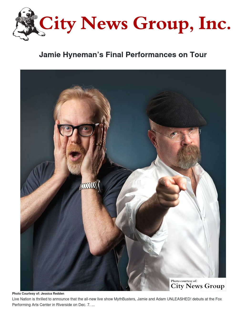 Live Nation is thrilled to announce that the all-new live show MythBusters Jamie and Adam UNLEASHED!, starring Jamie Hyneman and Adam Savage, co-hosts of the Emmy-nominated Discovery series "MythBusters,” debuts at the Fox Performing Arts Center in Riverside for one night only on Monday, Dec. 7.