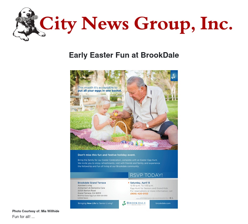 Be sure to visit Brookdale Grand Terrace this weekend for some early Easter fun! The assisted living center will be hosting a fun afternoon for seniors and grand kids filled with colorful eggs that contain a hidden surprise for them! Join the hunt and the fun this Saturday April 13, from 12:30 pm to 1:00 pm. For reservations or more information, call 909-420-0153.