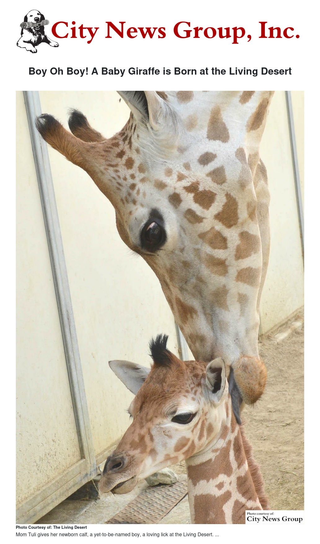 The Living Desert announced that its giraffe Tuli gave birth to a male calf on Friday, July 3, said Allen Monroe, president & CEO of The Living Desert.