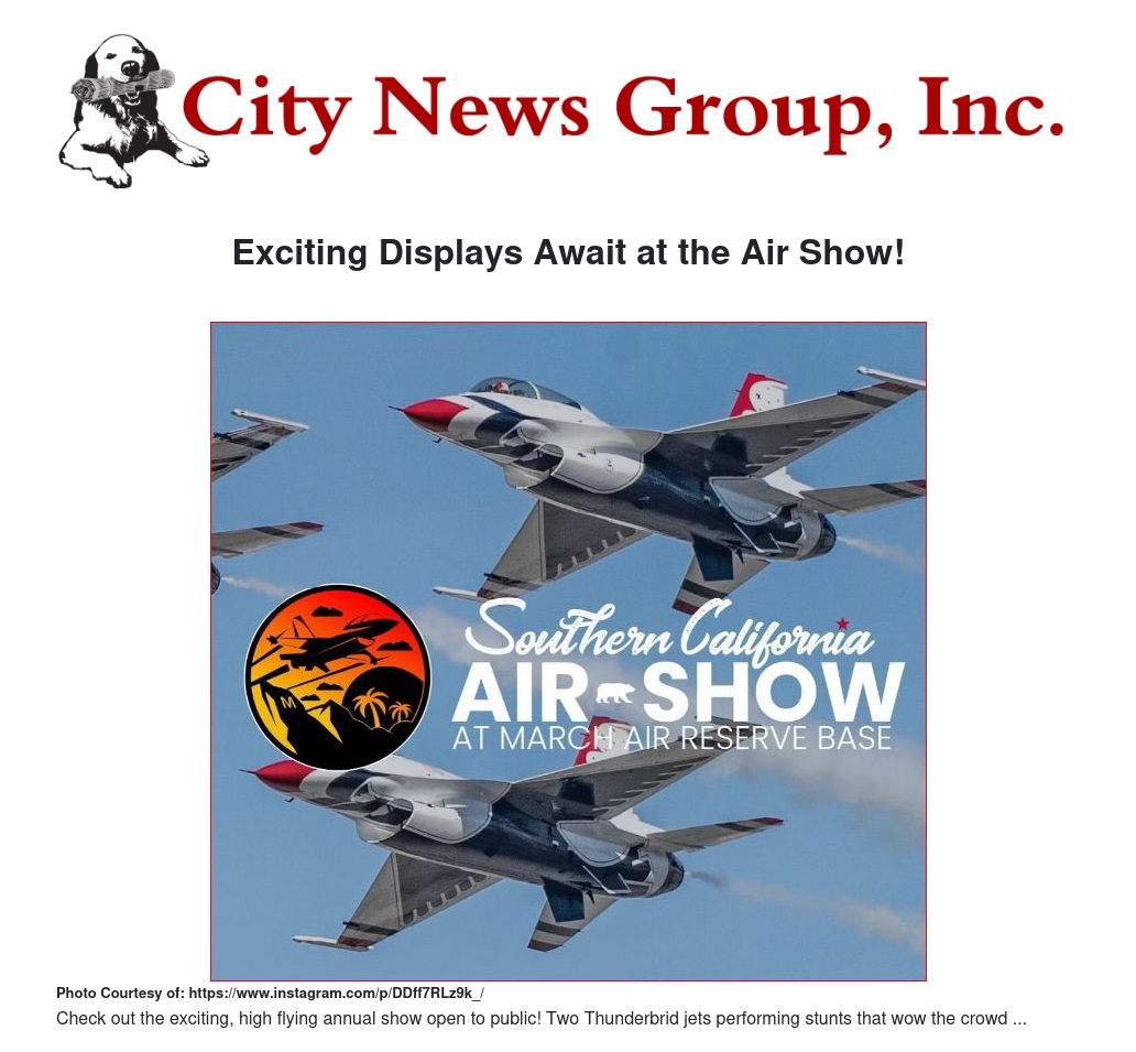The Southern California Air Show at March Field on April 12, 2025, promises an unforgettable experience for aviation enthusiasts and families alike. Whether you're a seasoned aviation aficionado or simply looking for a thrilling day out, this event guarantees excitement, education, and inspiration against the backdrop of Southern California's vibrant aerospace heritage.