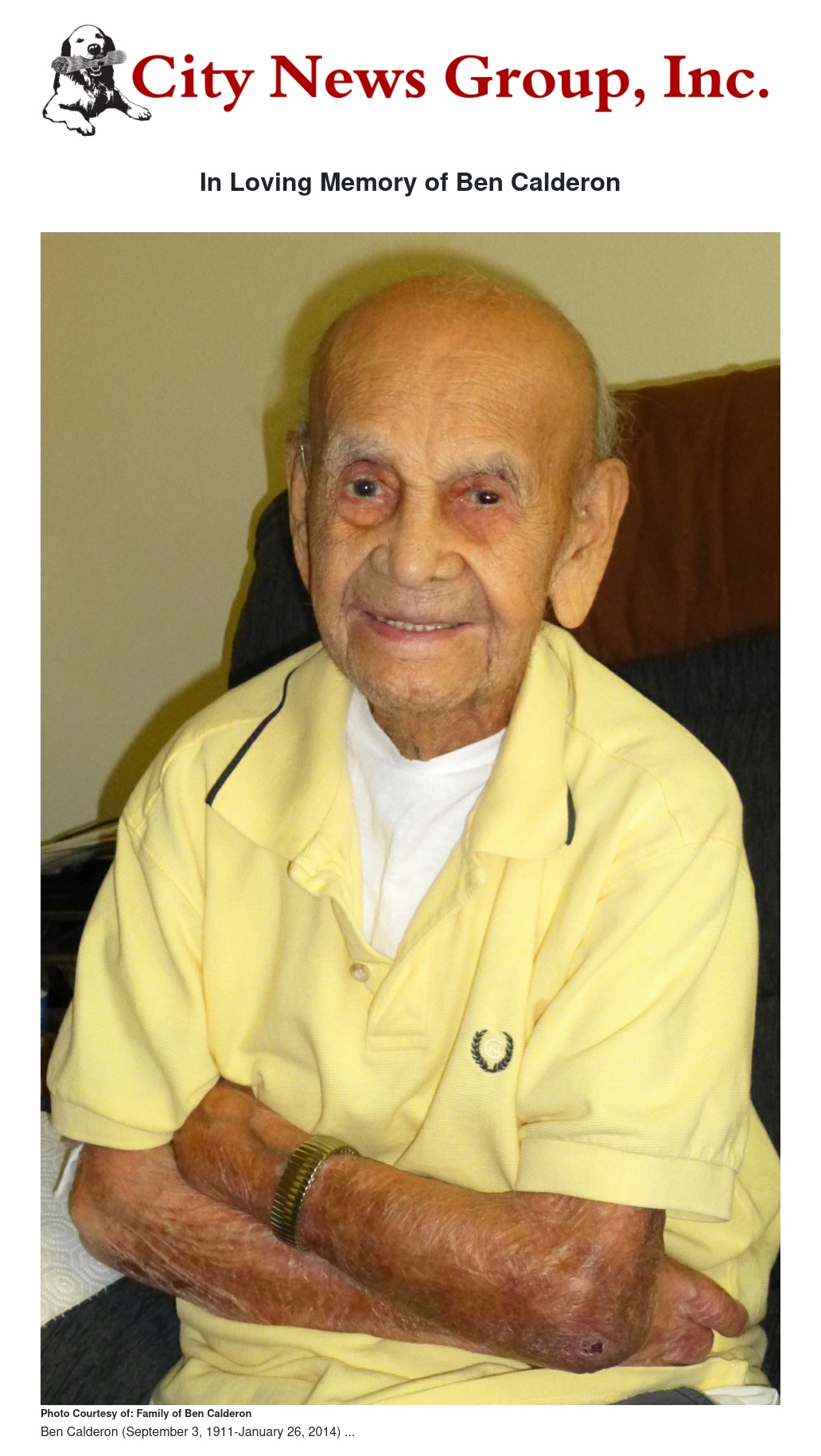 Ben Calderon is survived by his wife Guadalupe Calderon, daughters; Irene, Dolores, Magdalena, Connie and Veronica. Ben and his wife Guadalupe would have celebrated 68 years of marriage in March 2014.