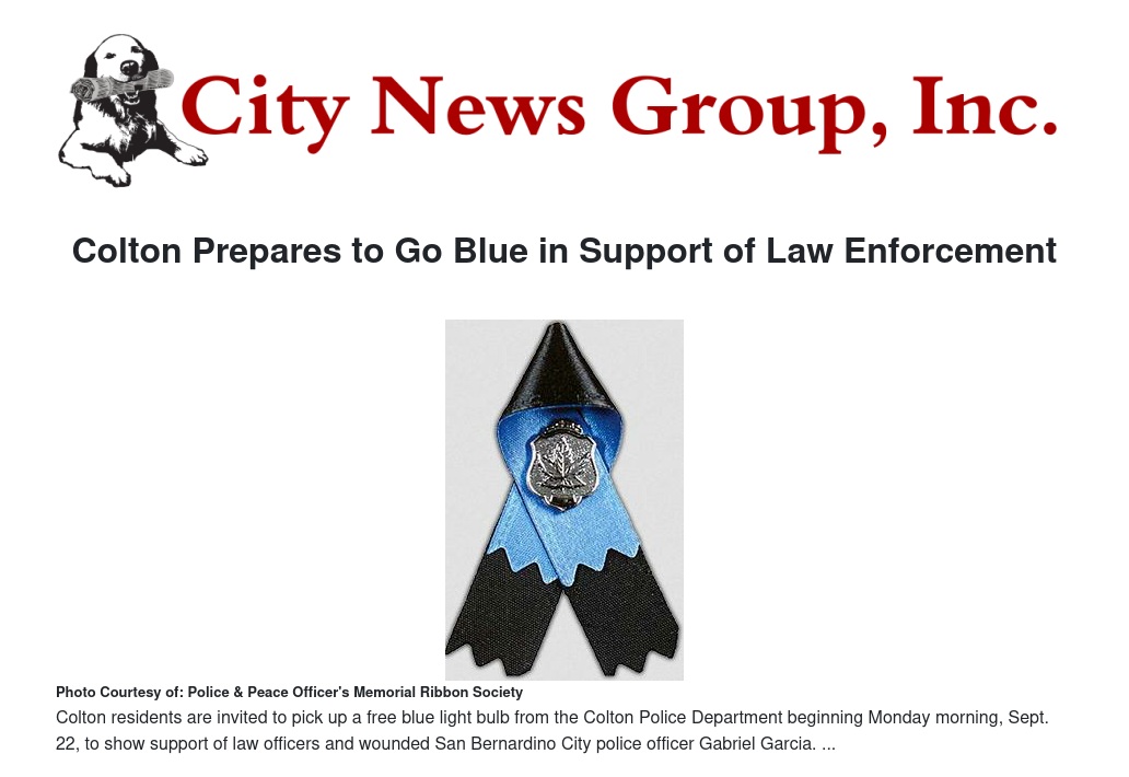 Beginning Monday, Sept. 22, Colton residents are invited to cover the city in shades of blue ribbons and lights to honor San Bernardino City police officer Gabriel Garcia, 31, who was critically wounded in a shooting in San Bernardino on Aug. 22.