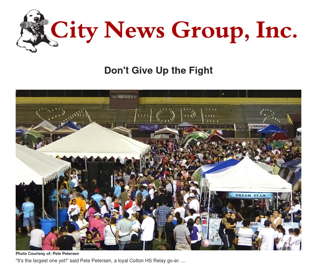 This year’s Relay For Life of Colton raised over $82,000. Team Unforgettable shared a few words about their experience on their Facebook page, “To every member of every team, to every survivor anywhere, to every loved one that has ever been lost to cancer. It was our honor to walk with you, in support of you and in memory of you. We are proud to be only one of 67 teams of the Colton Relay for Life. As a community, we have raised over $82,000 in an effort to support one cause. One community, working as one team looking for one result. Cancer is a word, not a sentence. Until next year...”