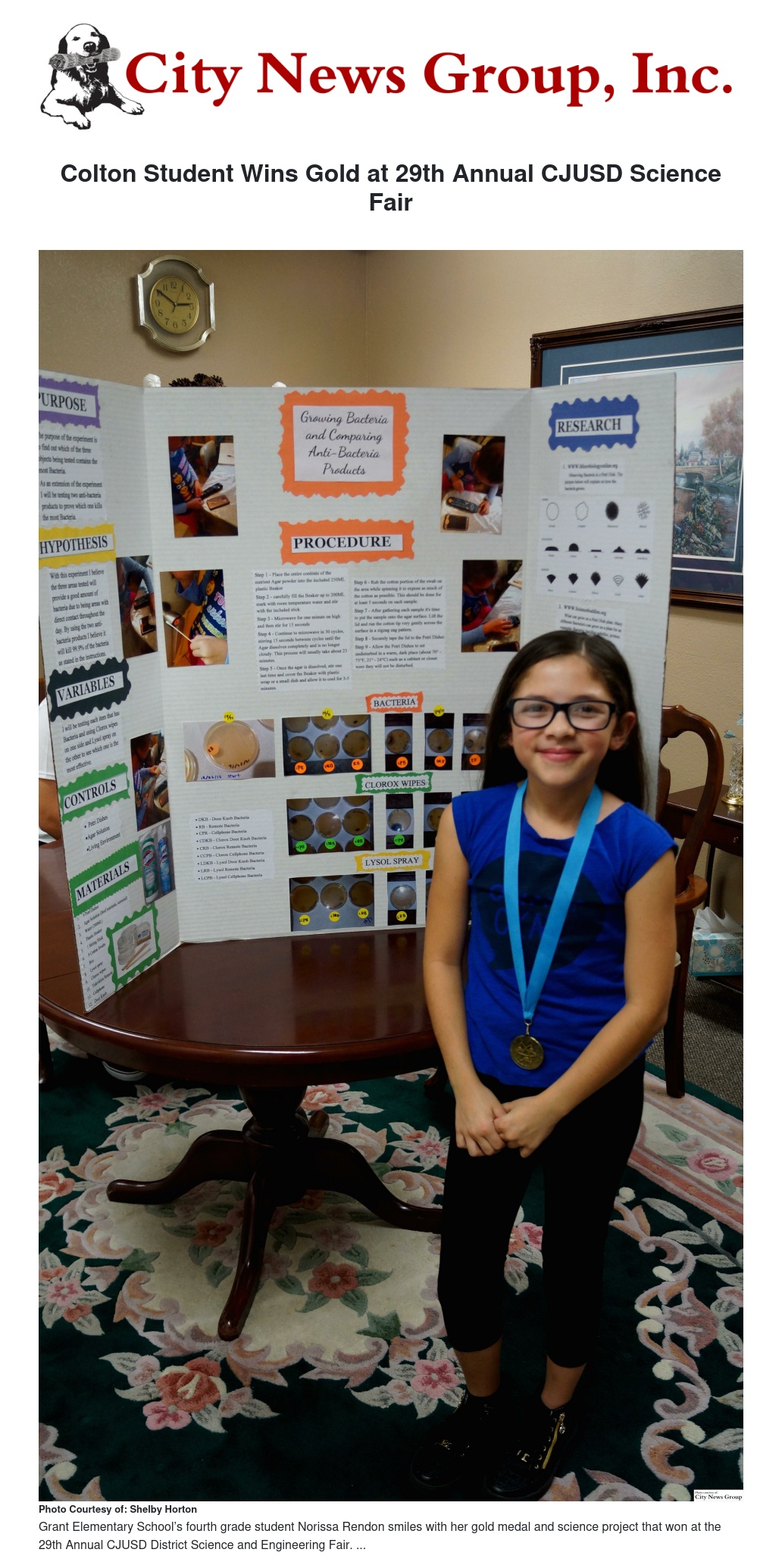 COLTON>> On Monday, Feb. 6, Grant Elementary School’s fourth grade student Norissa Rendon won the gold medal at the 29th Annual CJUSD District Science and Engineering Fair.