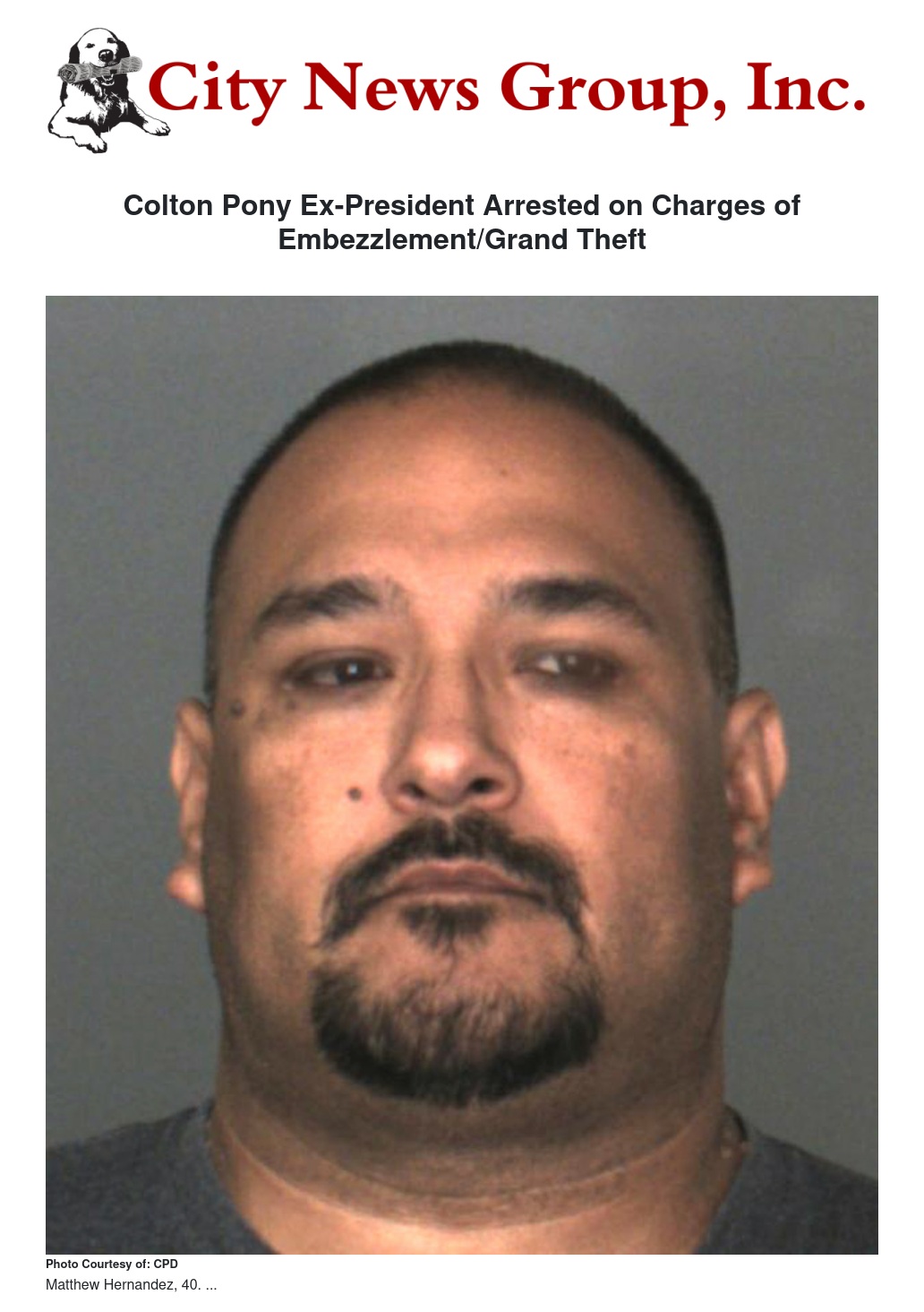 Matthew Hernandez, 40, was arrested on the afternoon of Nov. 25, following an investigation by Colton police. Hernandez came with police to the station to speak with detectives regarding unaccounted-for deductions from the league's general fund account, which he headed as president for less than six months.