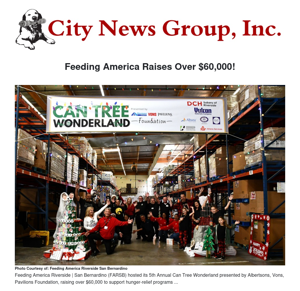 Feeding America Riverside | San Bernardino (FARSB) hosted its 5th Annual Can Tree Wonderland presented by Albertsons, Vons, Pavilions Foundation, raising over $60,000 to support hunger-relief programs. This holiday event featured an NY Rockin’ Christmas-themed food drive, bringing community groups together to feed the IE alongside the food bank.