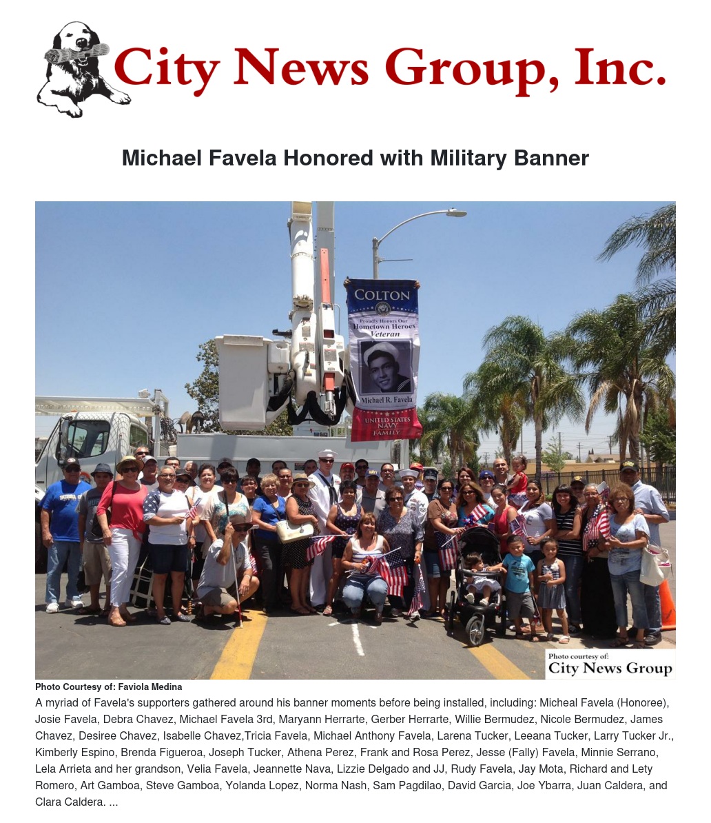 Local Navy Veteran Michael R. Favela was honored by his family, friends, and city of Colton with his very own military banner installation ceremony this past June.
