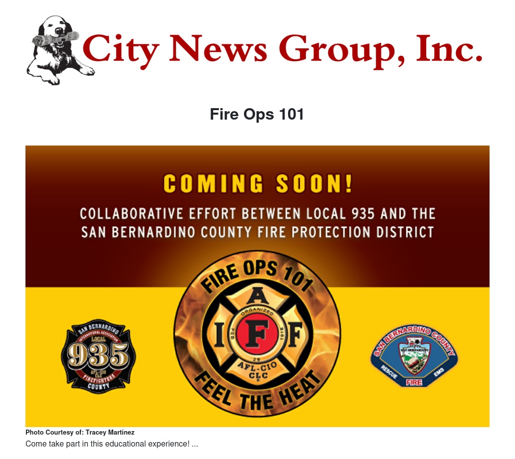 San Bernardino County Professional Fire Fighters IAFF Local 935, in partnership with the San Bernardino County Fire Protection District, will host FIRE OPS 101, a daylong program in which participants experience hands-on firefighting and rescue operations under the controlled supervision of professional Firefighters and Paramedics.
