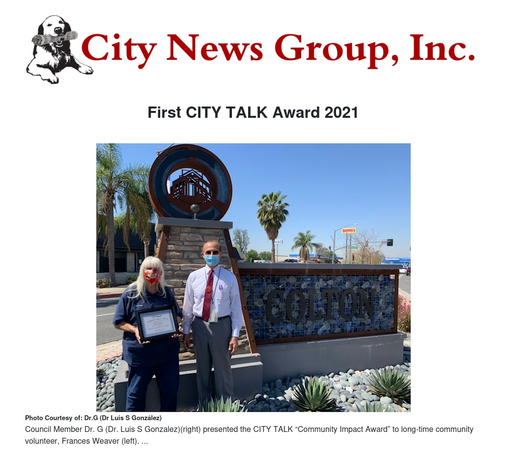 “This was my first opportunity to talk with Frances Weaver,” reflects Dr. G, and continues, “I’ve always known she was there, and felt this CITY TALK award would be the perfect way to recognize her years of service, as well as her tenacity for doing volunteer work.” “She simply has a ‘golden heart,’” adds Dr. G. Fire Chief Tim McHargue adds, “Frances has been serving the City of Colton over 20 years, and is a valued member of the Fire Department family,”