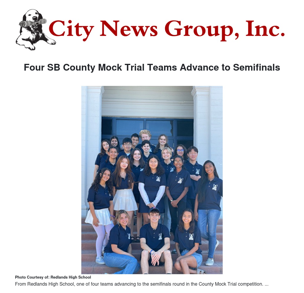 Four high school teams have advanced to the semifinals of the 40th annual San Bernardino County Mock Trial competition. Currently, Los Osos High School (Gold Team), Oak Hills High School (White Team), Ontario Christian High School and Redlands High School are scheduled to compete in person at the San Bernardino Superior Courthouse on Jan. 12 and 13. Updates to this schedule will be announced prior to the event if circumstances necessitate a change in venue or transition to a virtual platform.
