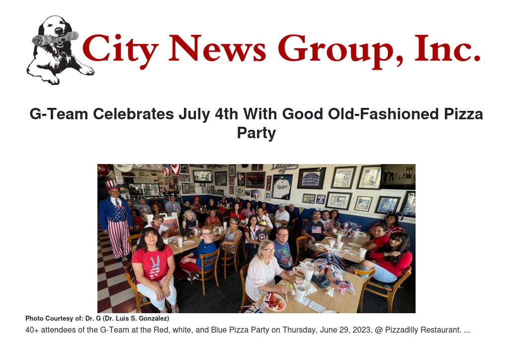 About 45 people joined Dr. G to enjoy the positive atmosphere. The event was held at Pizzadilly Restaurant at 194 East Valley Blvd, and owner Raymond Dorado, was a gracious host, along with his staff, Gloria (sister) and Denise (niece). “This was a nice event,” said Yaneth Murillo, who brought her three children to join in on the fun. Long-time G Team member Norma Gallardo added, “I really looked forward to this. It was a perfect way to celebrate the Fourth of July,” as she was referring to the decorations and the patriotic colors