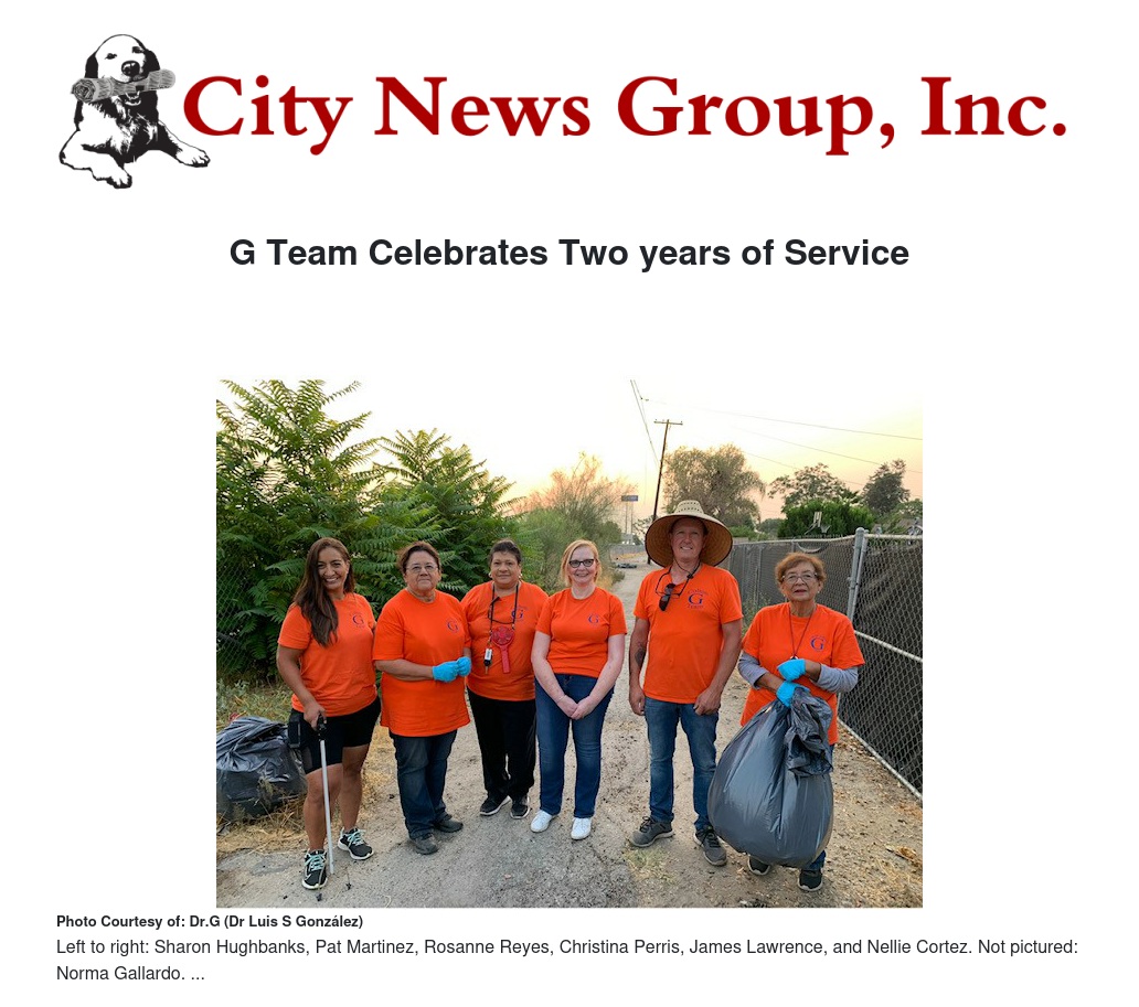 Currently, the core group of G Team members is made up of eight members, including; Nellie Cortez, Norma Gallardo, James Lawrence, Rosanne Reyes, Pat Martinez, Sharon Hughbanks, Christina Perris, and Dr. G. They are all residents of Colton, and they all care deeply for our City. All of them are volunteers, and come Tuesdays or Thursdays to help Dr G with various clean-up projects. Occasionally, they perform mini-trash clean-up projects (one bag), and on special projects, a Saturday will be planned. James Lawrence commented, “It’s a way to give back to the community, and help the residents appreciate their neighborhoods more.” Another member, Norma Gallardo added a personal touch, “I pick up trash to help make sure we keep our city beautiful.”