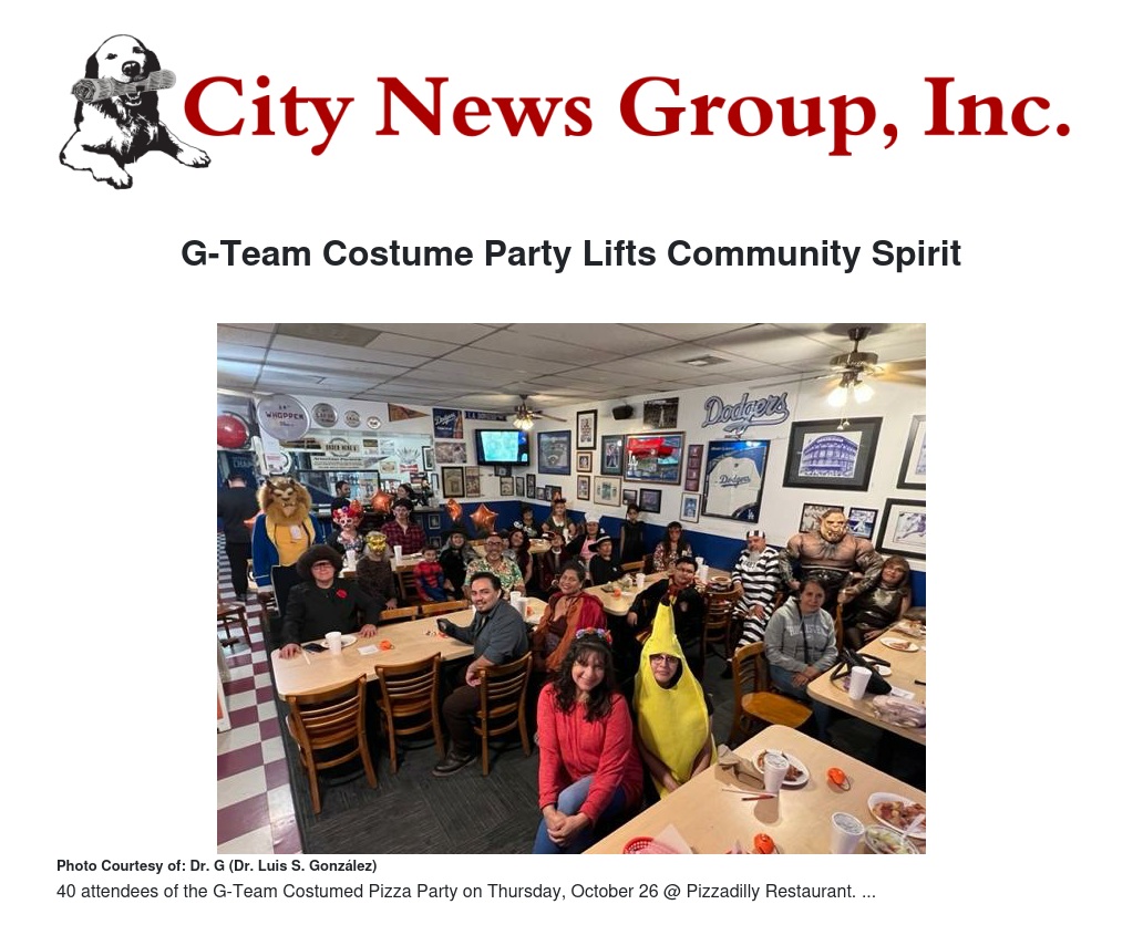 This costume pizza party was a good, creative way to celebrate the upcoming holidays and to generate genuine community spirit. It’s a great outreach of family, friends and community. Nothing extraordinary about it… Just caring for people. Congratulations to the G-Team for their continued community outreach, their volunteer efforts, and their positive contribution to community “Spirit.”