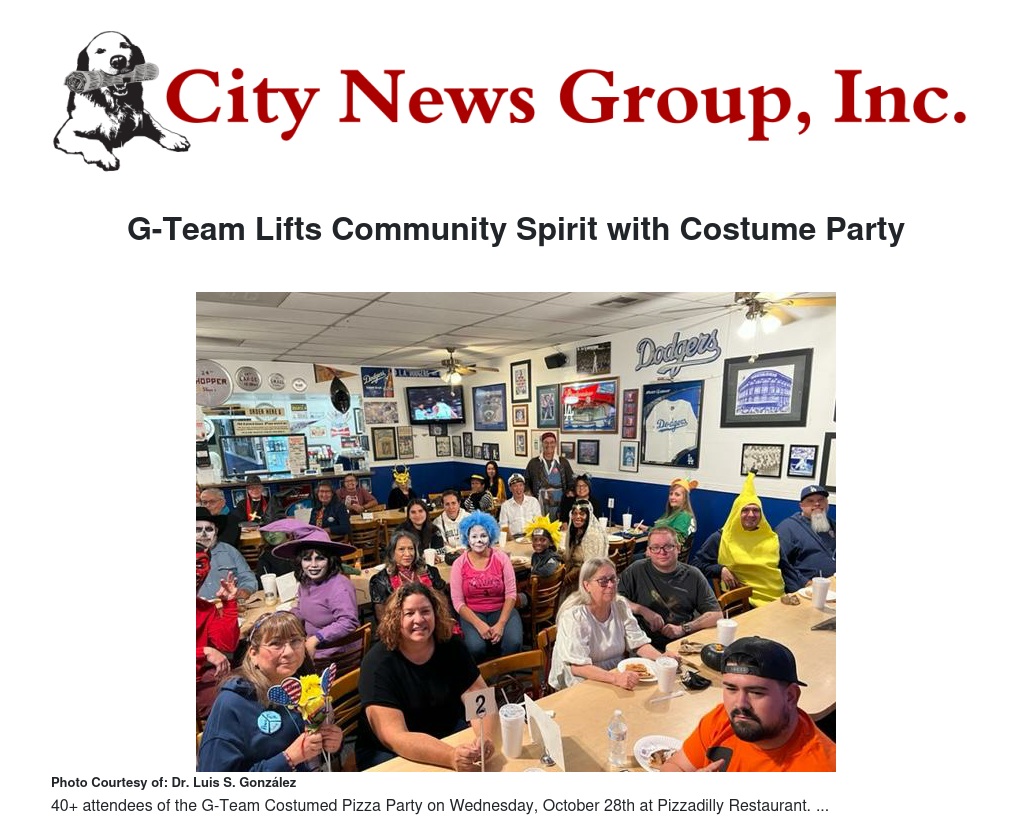 “It's really nice to get together and celebrate a positive spirit among the community,” says Julia Cardenas, one of Dr. G’s long-time supporters and planner of the costume pizza party. Another attendee, Evelyn Lopez commented, “We had a great time and laughed.” While talking, she pointed to the interesting costumes worn by individuals in the group. Everyone came in costume, even Dr. G who is well-known in the community for dressing up in costume for the holidays. Among the attendees were a flower child, the Hamburglar, and a princess. Dr. G came dressed like a pirate…Yo-ho, yo-ho!