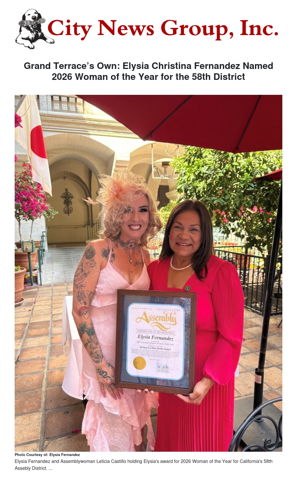 Grand Terrace’s Own: Elysia Christina Fernandez Named 2026 Woman of the Year for the 58th District by Margie Miller, Publisher - City News Group, Inc.