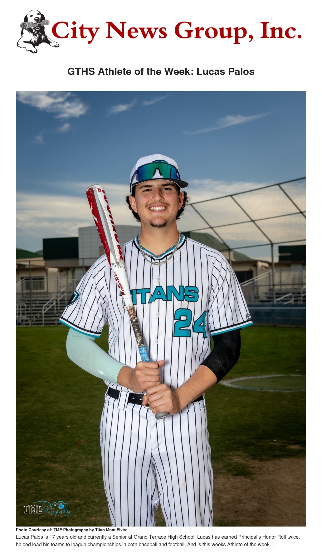 GTHS Athlete of the Week: Lucas Palos by Titan Mom Elvira - City News Group, Inc.