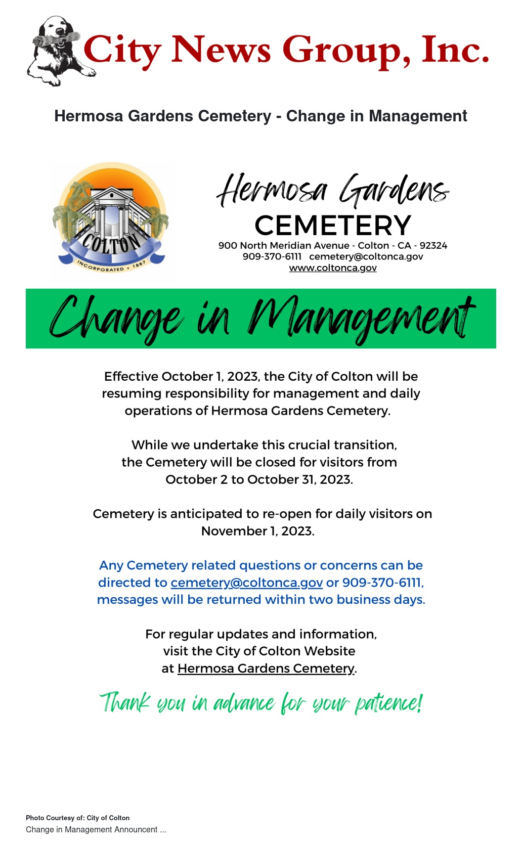 The City of Colton announces that, effective Sunday, October 1, 2023, Hermosa Gardens Cemetery will transition back under City management and operations. Since 2000, Cemetery management & operations has been handled by Inland Memorial, Inc. through a long-term lease agreement. Due to changes within that organization, there was an opportunity to end the lease and resume management. Recognizing the profound significance of Hermosa Gardens Cemetery in the lives of residents and the families of those interred there, the City Council and Staff are committed to ensuring a smooth transition and delivering the highest standard of care.