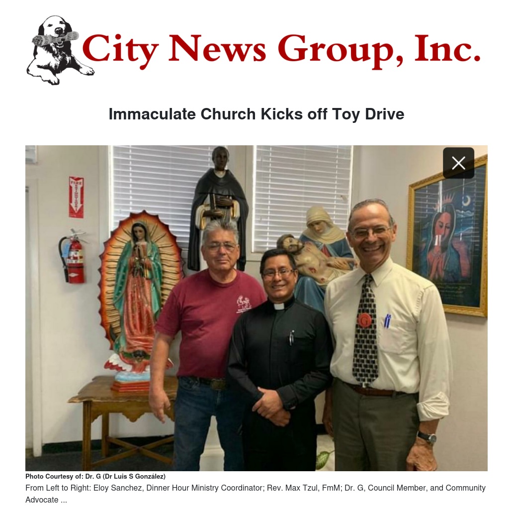 For the 33rd year, the Immaculate Church “Dinner Hour” program kicked off its annual Children’s Toy Drive last week with a donation from Dr.G, (Dr. Luis S Gonzalez) Council Member and well-known Community Advocate.