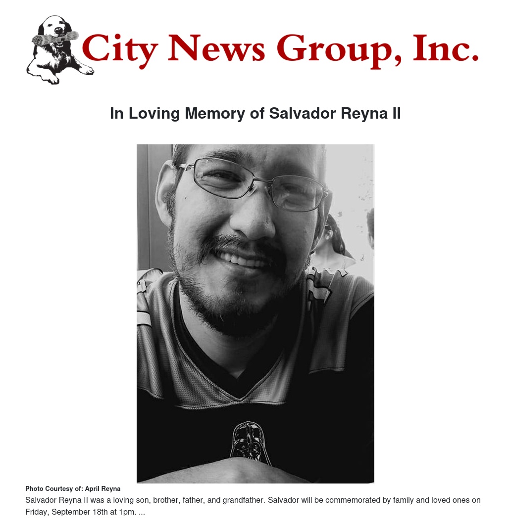 Salvador was preceded in death by his father, Salvador S. Reyna, and father-in-law Evaristo “Buddy” Guitron. He is survived by his wife, Eleanor Reyna, daughter, Corina Guitron and son, Jeremy Balmoja Jr, and 3 grandchildren, Jey, Savy, and Aly, his mother in law Jennie Guitron, his mother, Cynthia Betancourt, sisters, April Reyna, Corinna Cranbourne, and JennaRose Reyna, grandparents Ruben and Dora Betancourt, brother in laws, Marty Guitron, Albert Guitron( Rose), Ruben Guitron (Diane), and Anthony Cranbourne, Sister in laws, Veronica Guitron and Michelle Flores (Rick) and many nieces and nephews and his beloved grandpups.