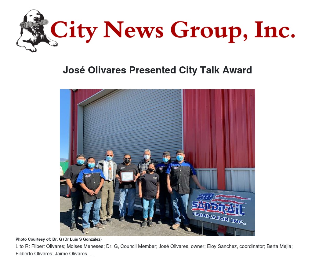 On Wednesday, February 9, 2022, Council Member Dr. G (Dr. Luis S González) presented the CITY TALK “Community Impact Award” to José Olivares, owner of SanRail Fabricators located at 293 W Olive Street in Colton.