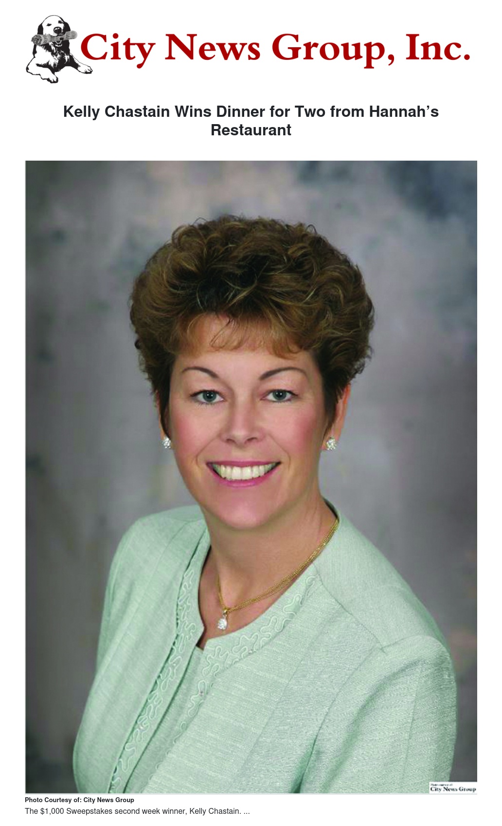 Kelly Chastain is the second week’s winner of the City News Group, Inc. $1,000 sweepstakes opportunity drawing. As the second winner of the weekly prize giveaway, Chastain has won a delightful dinner for two from local favorite, Hannah’s Restaurant.
