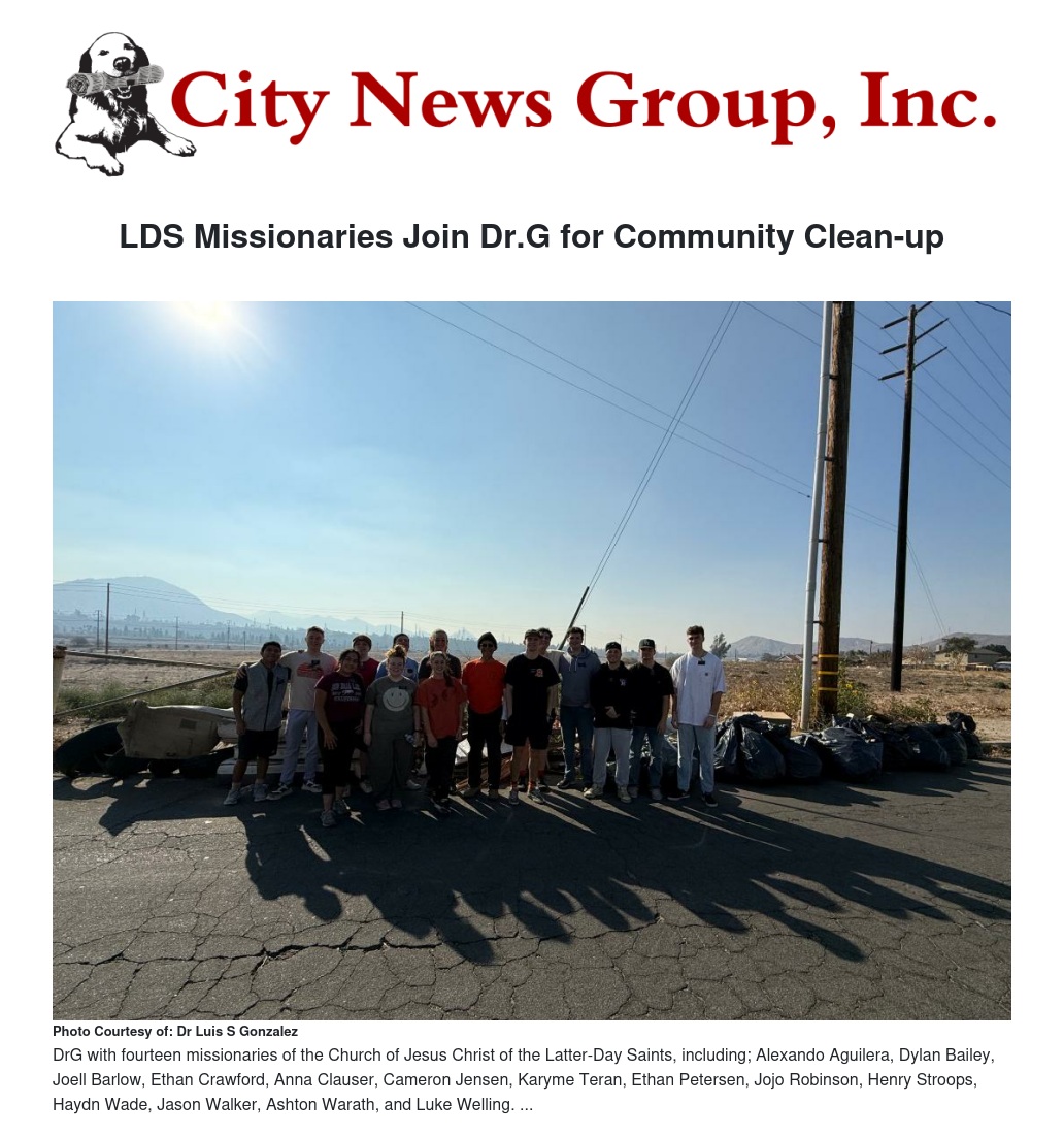 Over the last ten years, Dr.G has been leading a number of clean-up efforts throughout the downtown area, south Colton, and La Loma Hills. From time to time various community groups such as the Missionaries have joined in to offer some assistance in picking up trash, and in some cases, cleaning up areas that have experienced dumping of bulk items. Once completed, the clean-up project is a great success and makes the area noticeably better. As a result, everyone wins – the area is clean, the participants enjoy service to the community, travelers see a nice corridor, and nearby residents enjoy a welcoming neighborhood. This was a great community effort and much appreciation goes to the young missionaries for volunteering their labor and time.