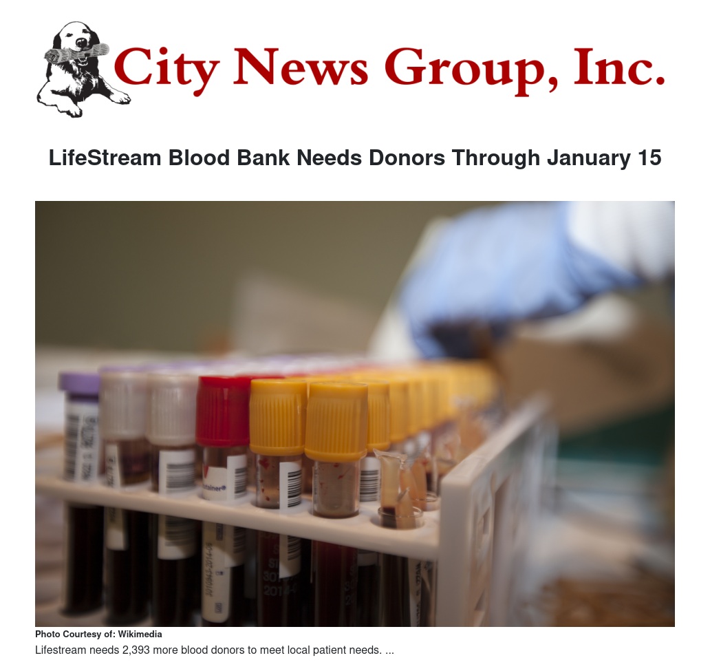 Last week, LifeStream needed 1,750 donors from Jan. 6 through Jan. 8 while battling rainy weather. The community blood supply is still down to just hours of supply. O negative donors are specifically needed. O negative is regularly used for babies in neonatal intensive care units at local hospitals.
