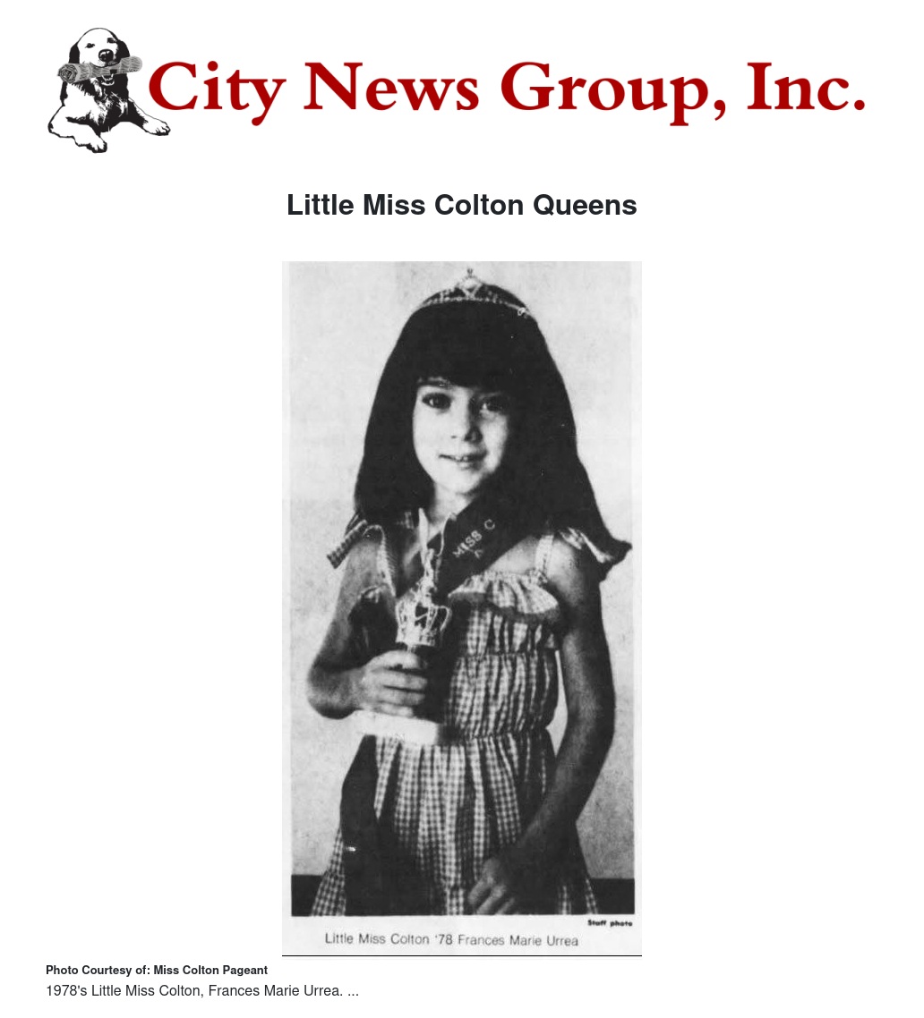Age Divisions are as follows: Toddler Miss - ages 2-3 years old, Little Miss – ages 5-6, Junior Miss – ages 7-9, Pre-teen Miss – ages 10-12, and Jr. Teen Miss – ages 13-14. Each contestant must live in the City of Colton or it’s unincorporated areas.