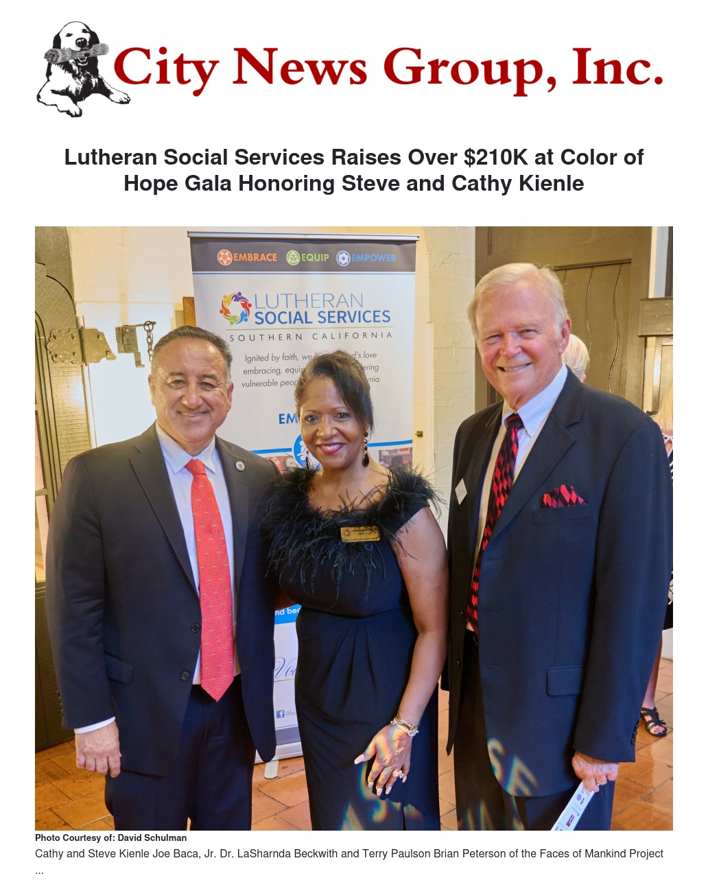 Lutheran Social Services of Southern California (LSSSC) - a leading provider of social services programs in Southern California – raised over $210K at its Color of Hope Gala & Awards on October 7 among 215 guests. The elegant affair held at the historic Mission Inn in Riverside honored Steve and Cathy Kienle of Walter’s Automotive and featured a moving art project by Brian Peterson of Faces of Mankind.