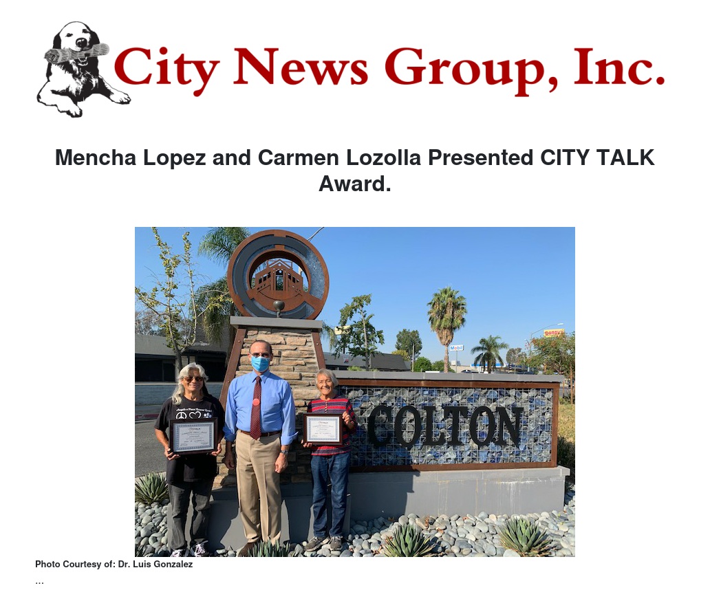 The CITY TALK “Community Impact Award” was recently established to recognize the great efforts that people make “behind the scenes” to make our community, the City of Colton, a better place. “I think Mencha and Carmen are a great choice for this recognition. Their efforts are exactly what this award is about,” smiles Dr. G, a City Council Member and well-known community advocate.