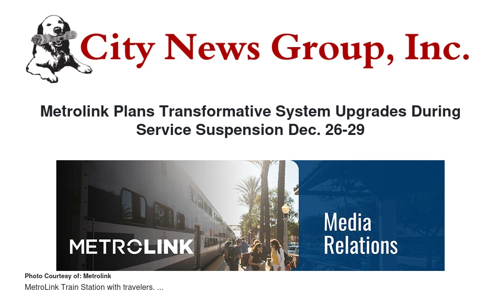 Metrolink will pause service systemwide from Dec. 26-29 to complete infrastructure upgrades, maintenance and repairs. Trains will not run on any of Metrolink’s seven lines, and Arrow service will also be suspended during this time. Planned work will help Metrolink provide safer, more efficient service as the Los Angeles mega-region prepares to host high-profile international events, including the 2028 Olympic and Paralympic Games, in the coming decade.