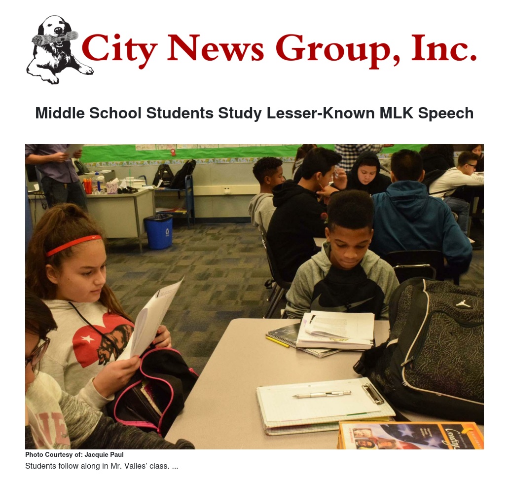 Students in local Middle School social studies classes in Colton, Grand Terrace, and San Bernardino spent time last week examining Dr. Martin Luther King Jr.’s life, legacy, and connection to their own lives as they read and studied a lesser-known speech he gave to junior high school students 50 years ago, titled “What Is Your Life’s Blueprint?”