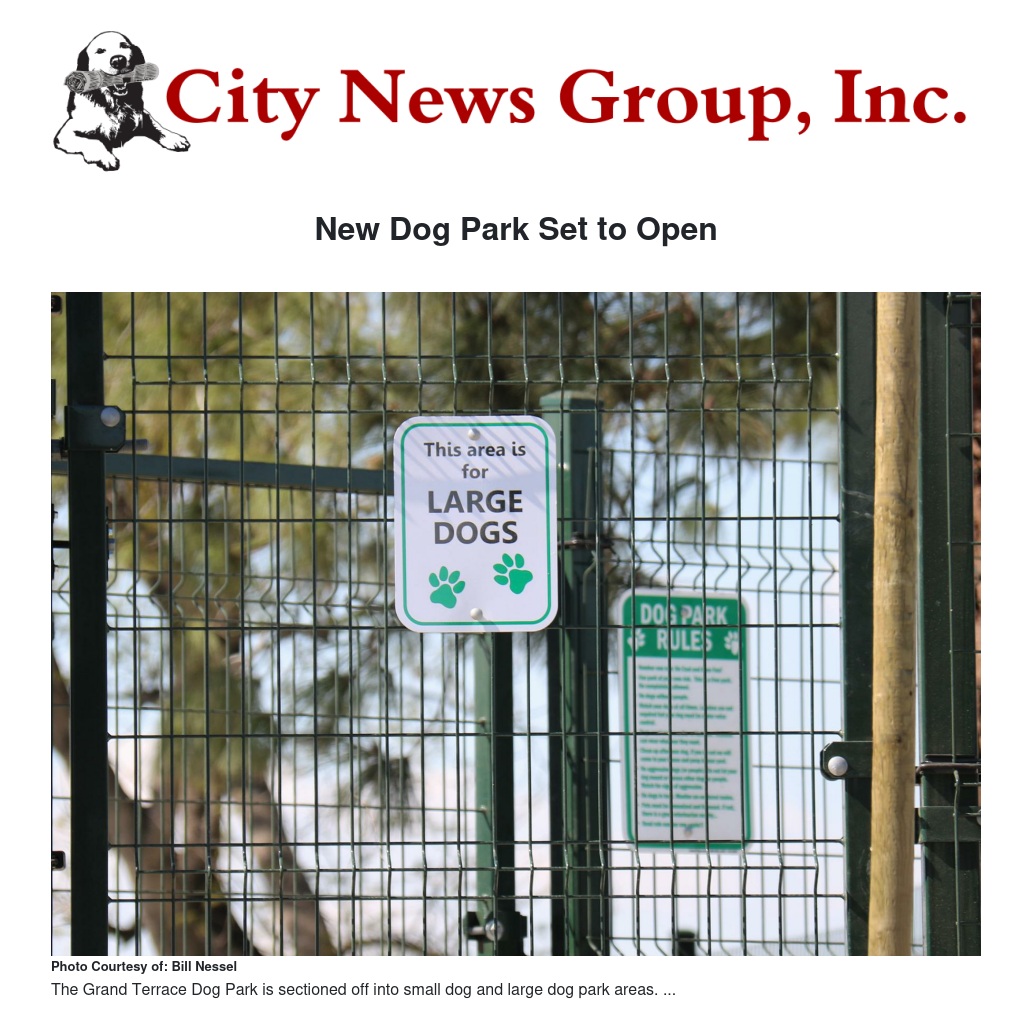 The Grand Terrace Dog Park will be open 6 days per week to start (closed Wednesdays), to allow the park’s vegetation to rest and mature. Park hours will be from dawn until dusk. The City is currently looking for a Dog Park Volunteer to open and close the park. Interested residents may access the City of Grand Terrace Volunteer Application by visiting City Hall or by accessing the link below: www.tinyurl.com/gt-dog-park-volunteer.