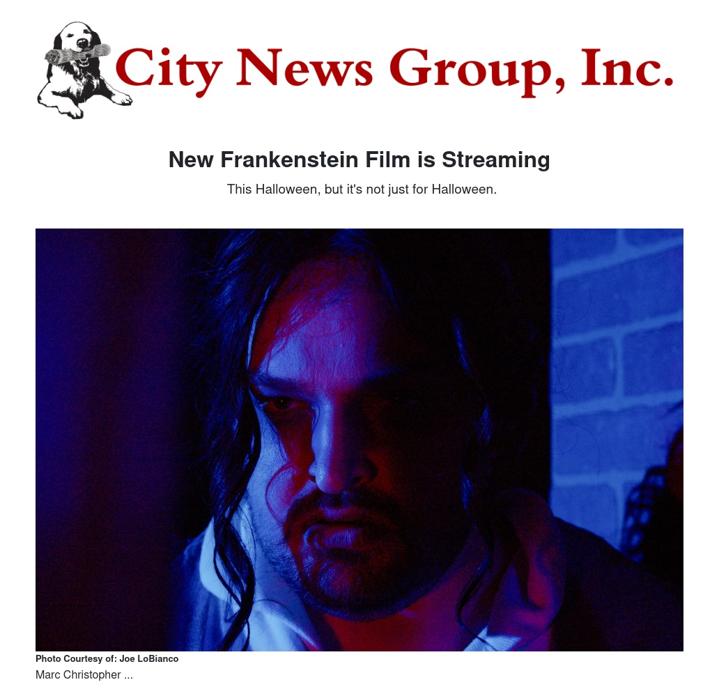 The latest Frankenstein movie is available for this Halloween. It can be streamed on-demand at StreamingMusicals.com. The Joe LoBianco film is a compelling adaptation of Mary Shelley's frightening work of horror, sci-fi and romance. It is a musical drama with haunting melodies and a "Phantom-like" score, written and composed by Eric B, Sirota, and adapted for film from his long-running and successful Off-Broadway musical.