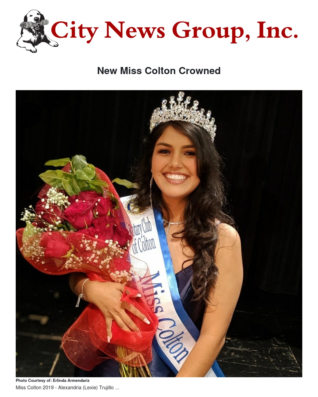It has been about 25 years give or take since the last Miss Colton was crowned. Since about 1993, when the last Miss Colton officially crowned. However, thanks to the Rotary Club of Colton, Alexandria (Lexie) Trujillo was crowned Miss Colton 2019. Breaking the 25 year streak of the city not having a Miss Colton. The newly crowned Miss Colton is 17 years old, attends Colton High and is the daughter of Angelina Romero and Stacy and Jesus Trujillo.