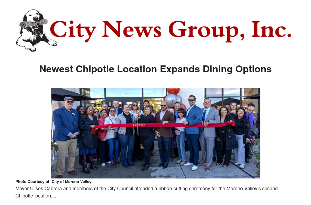 On Wednesday, January 7, Mayor Ulises Cabrera and members of the City Council attended a ribbon-cutting ceremony for the Moreno Valley’s second Chipotle location, adding another dining option to Eastern Moreno Valley.