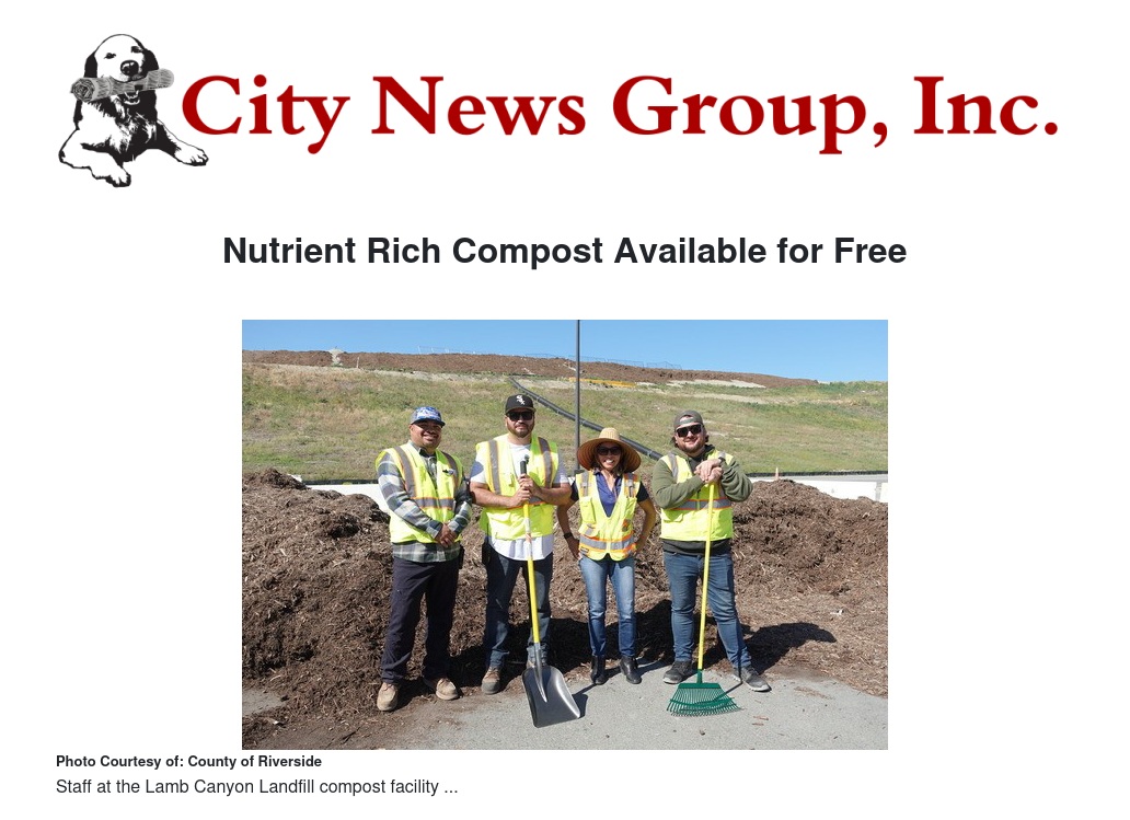 The Riverside County Department of Waste Resources has been making compost from organic clean green waste material processed, at the Lamb Canyon Landfill compost facility, and will make the finished compost material available for Free.